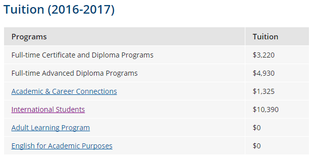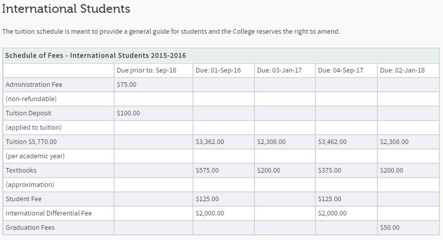 1년 수업료(Tuition)는 아래와 같습니다. 1년 수업료가 캐내디언은 $3,220, 유학생은 $10,390 입니다. 어느 학교든 유학생의 학비는 상대적으로 많이 비쌉니다.